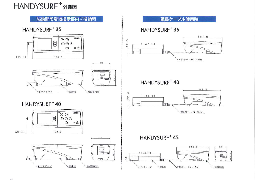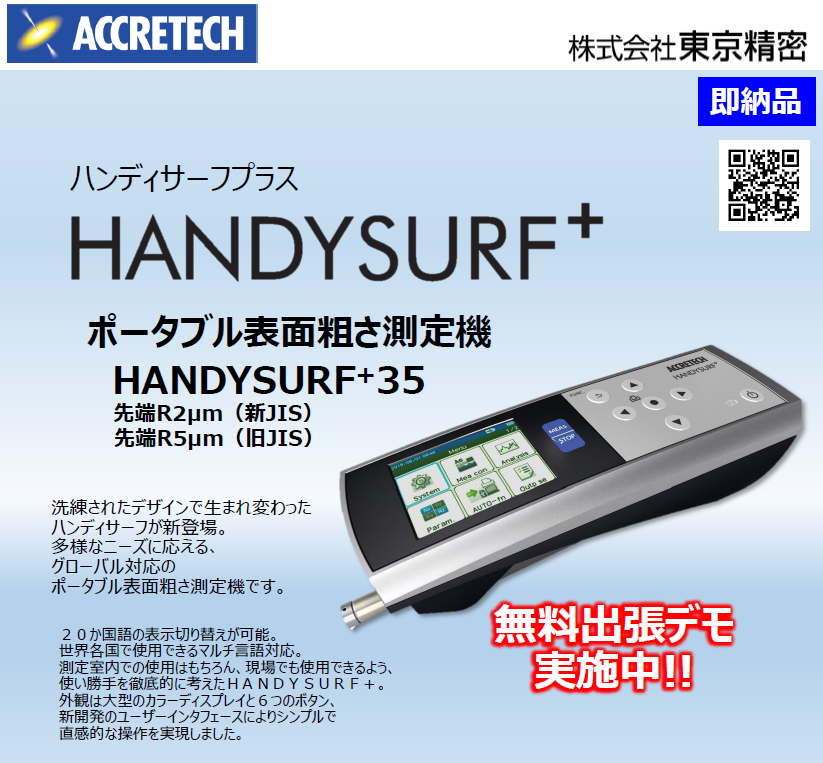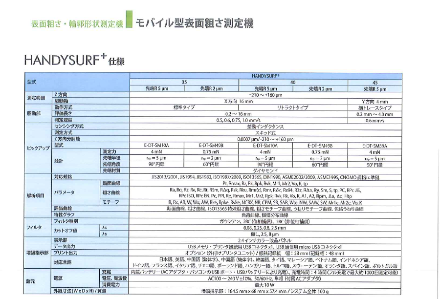 この新型「HANDYSURF+」は、洗練されたデザインと高機能を備えたポータブル表面粗さ測定機で、標準タイプ(35)、リトラクトタイプ(40)、横トレースタイプ(45)の3種類が展開されています。