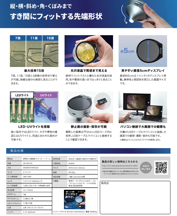 スリーアールソリューションの 3R‑MJL03(マジックルーペ アール) は、曲面や凹凸面の観察に特化した“携帯型LED顕微鏡”です。最大15倍ズームと高コントラスト液晶で、細部の確認作業を手軽に行えるのが大きな特徴です。